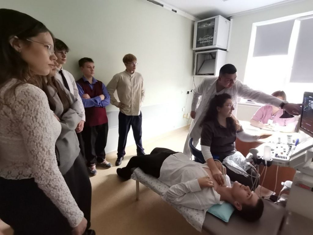 Также школьникам показали работу современного аппарата УЗИ и объяснили, как ультразвуковая диагностика помогает врачам ставить точные диагнозы.