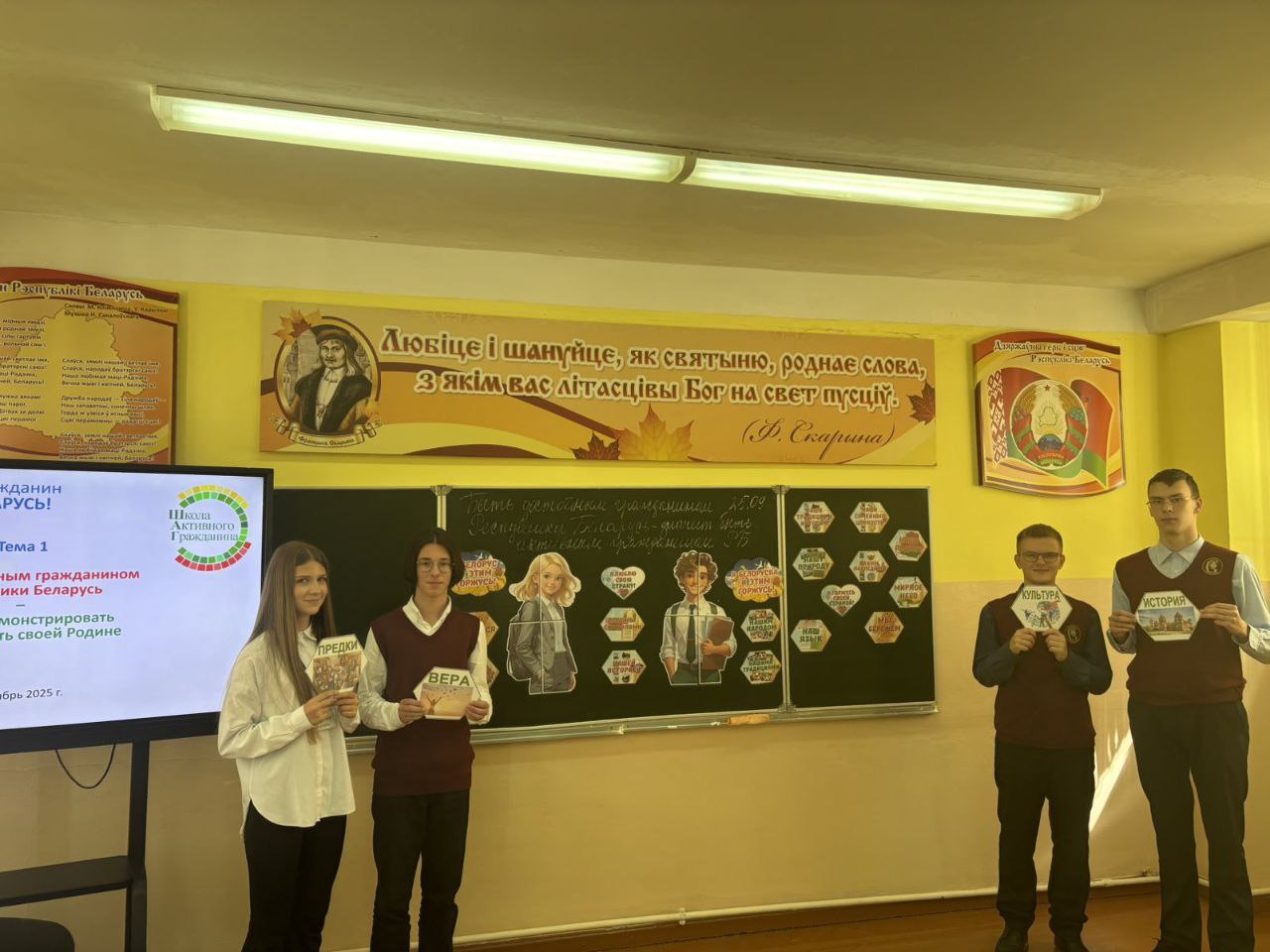 23 октября 2025 в рамках проекта «Школа активного гражданина» в гимназии №1 прошёл информационный час по теме «Быть достойным гражданином Республики Беларусь – значит чтить законы своего государства и брать на себя ответственность за будущую судьбу своей страны» В фокусе обсуждения были темы: о деятельности органов ученического самоуправления; молодежный парламент; Совет молодых ученых при Министерстве образования Республики Беларусь, идеи для развития своего региона.